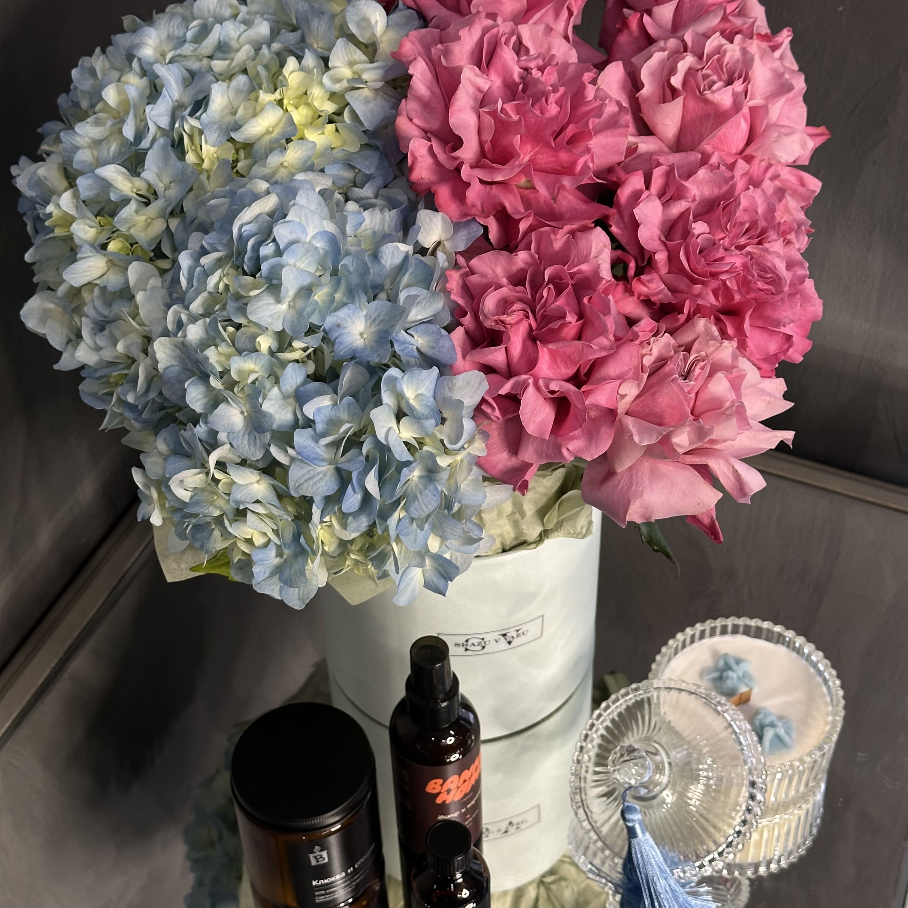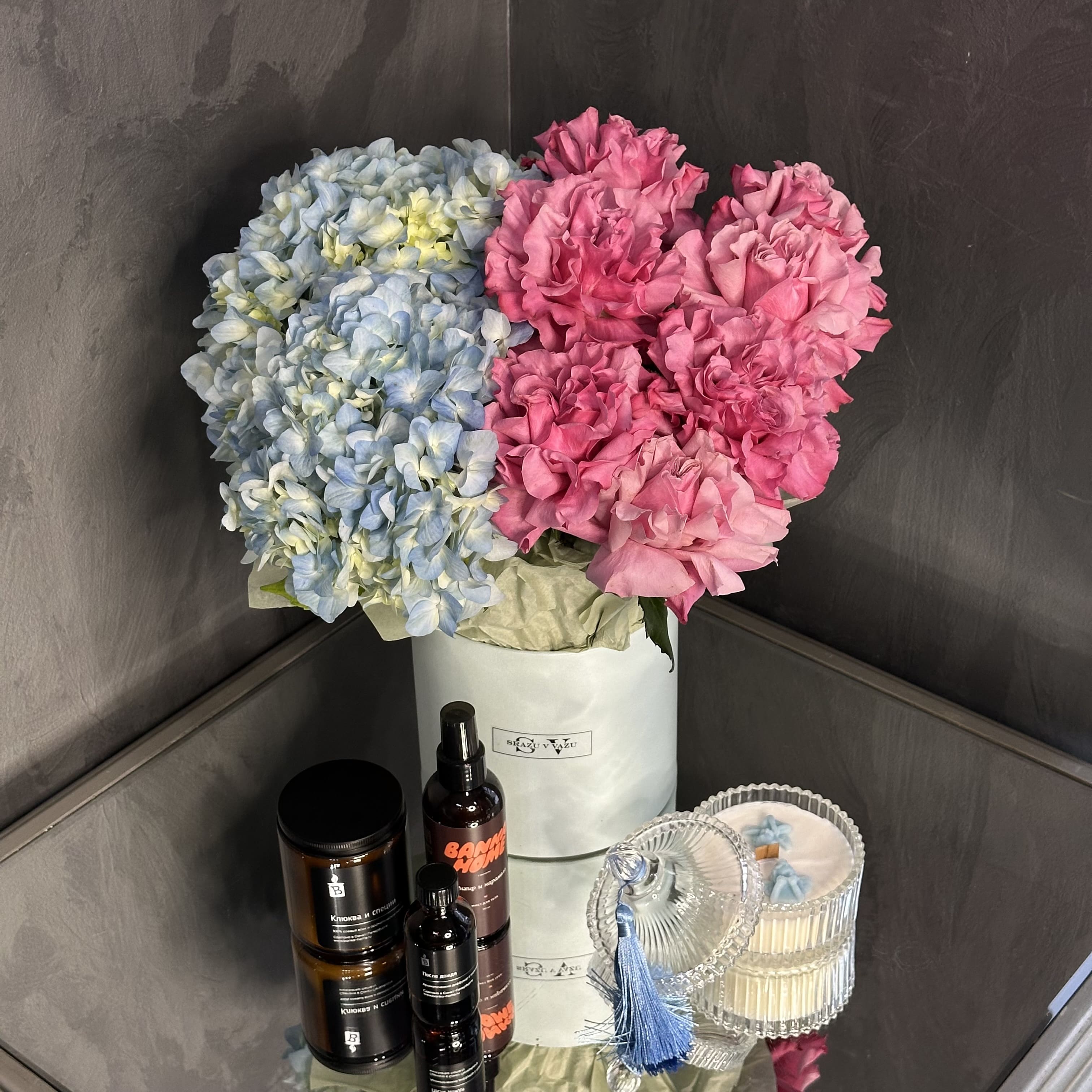 Композиция из голубых гортензий и французских роз сорта COUNTRY BLUES представляет собой элегантное сочетание нежных оттенков синего и серого цветов, создающее атмосферу утонченности и спокойствия. Гортензии своей пышностью добавляют композиции объем и воздушность, тогда как розы COUNTRY BLUES своим благородством оттеняют её природную красоту.