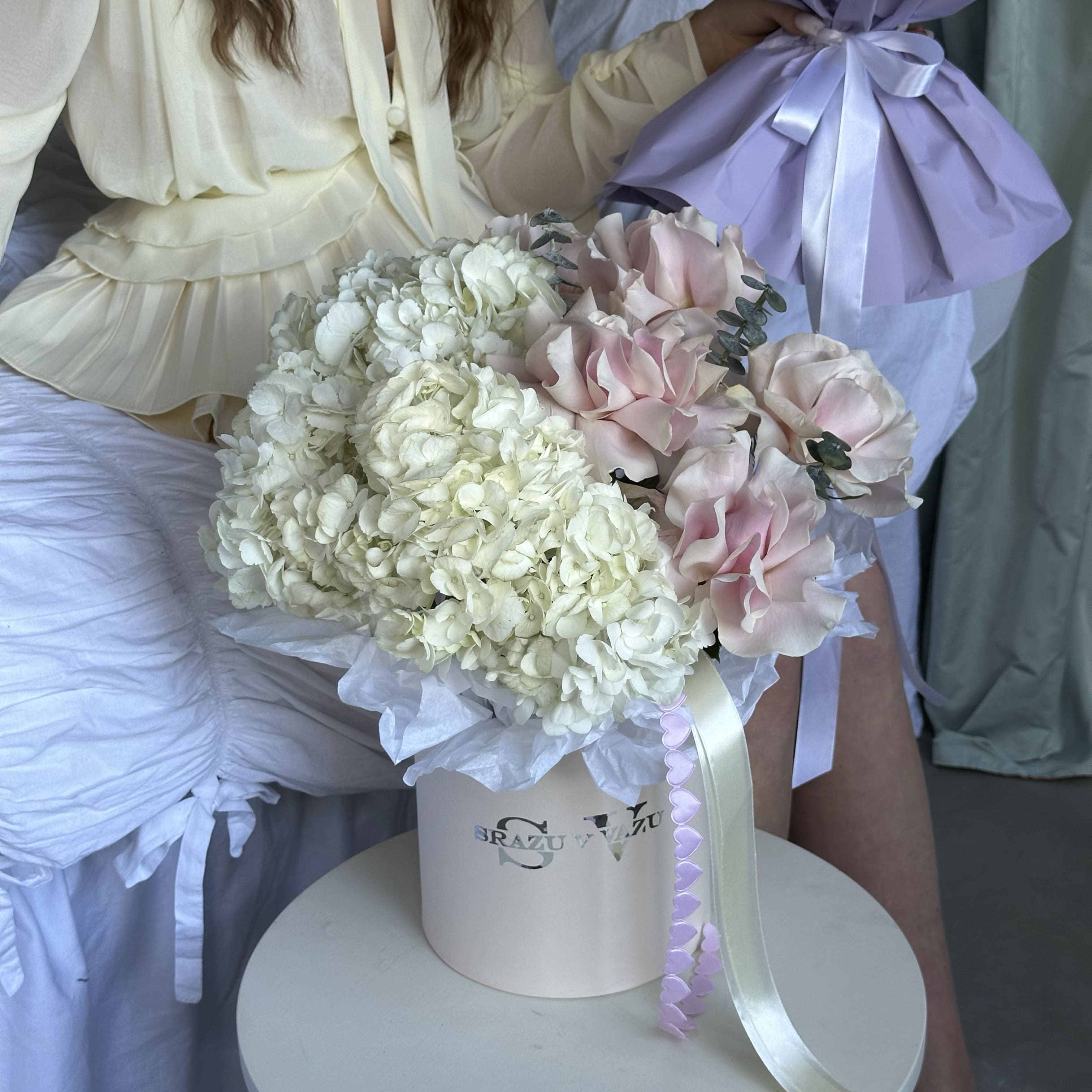 Композиция из белоснежных гортензий и нежнейших роз сорта PINK MONDIAL — воплощение изысканности и утончённости. Гортензии дарят чувство спокойствия и гармонии, а французские розы добавляют композиции элегантности и лёгкого романтического шика. Этот букет станет идеальным подарком для выражения тёплых чувств и восхищения, украсив собой любое событие и подчеркнув особую атмосферу праздника.