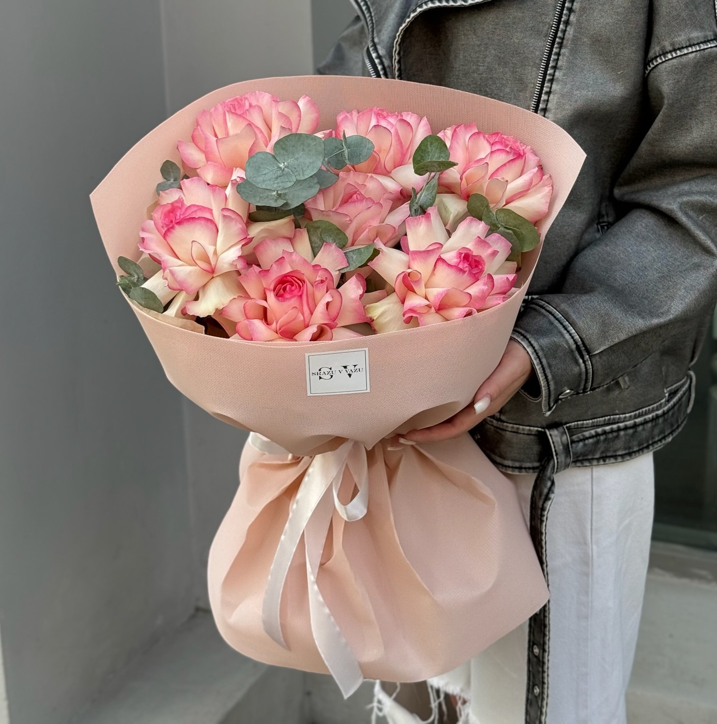 Заказать Букет французских роз «ESPERANCE» 7шт с эвкалиптом с доставкой по Самаре