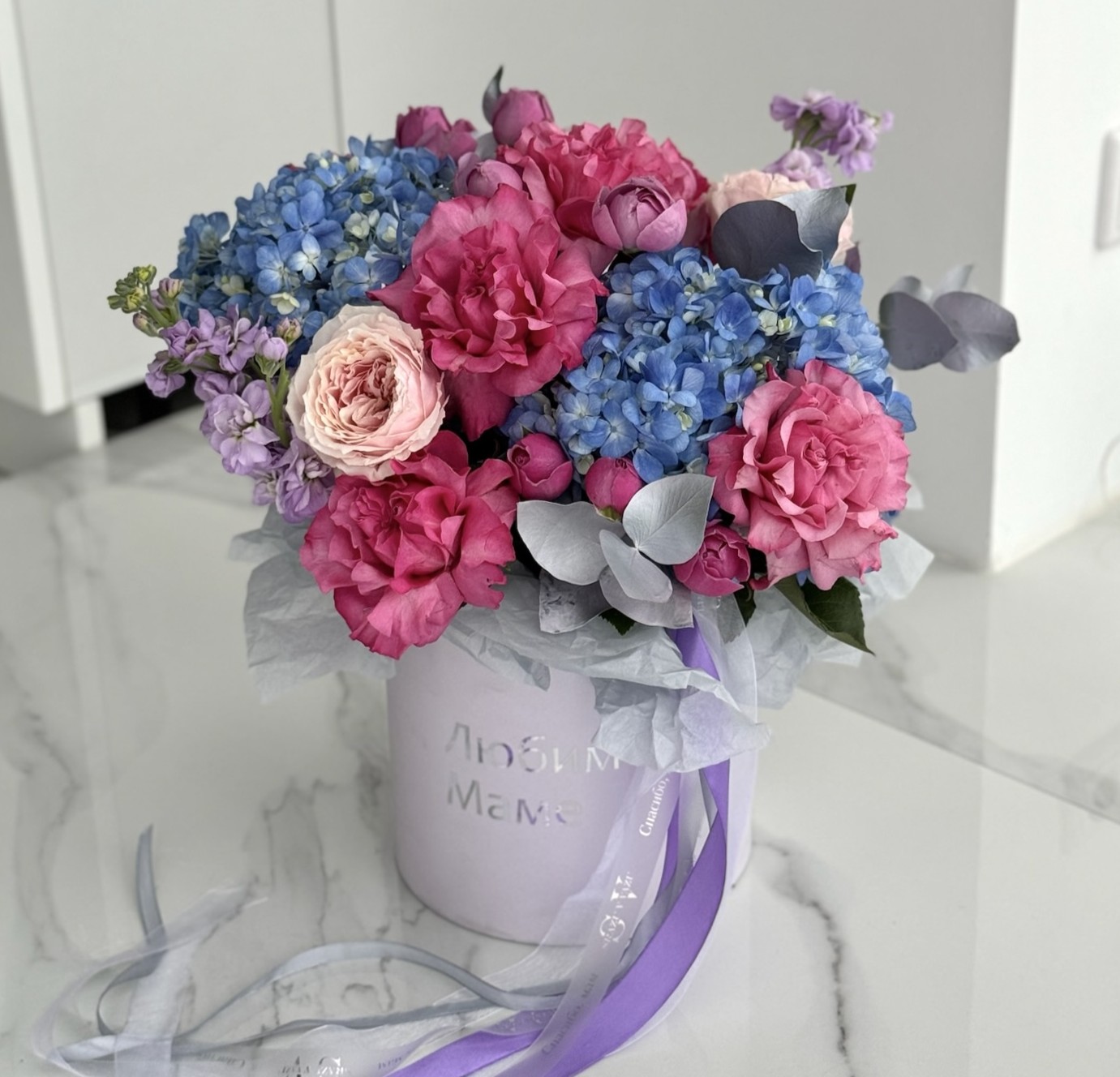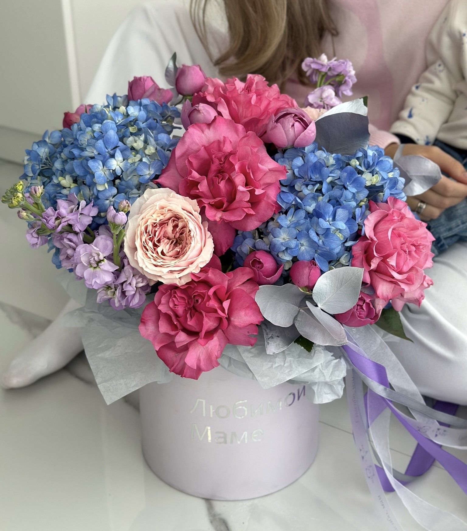 Эта яркая композиция в шляпной коробке - идеальный подарок для неповторимой женщины. В её составе - насыщенная синяя гортензия, элегантная роза кантри блюз, а также нежная сиреневая маттиола, которая гармонично сочетается с фиолетовыми и розовыми оттенками.
