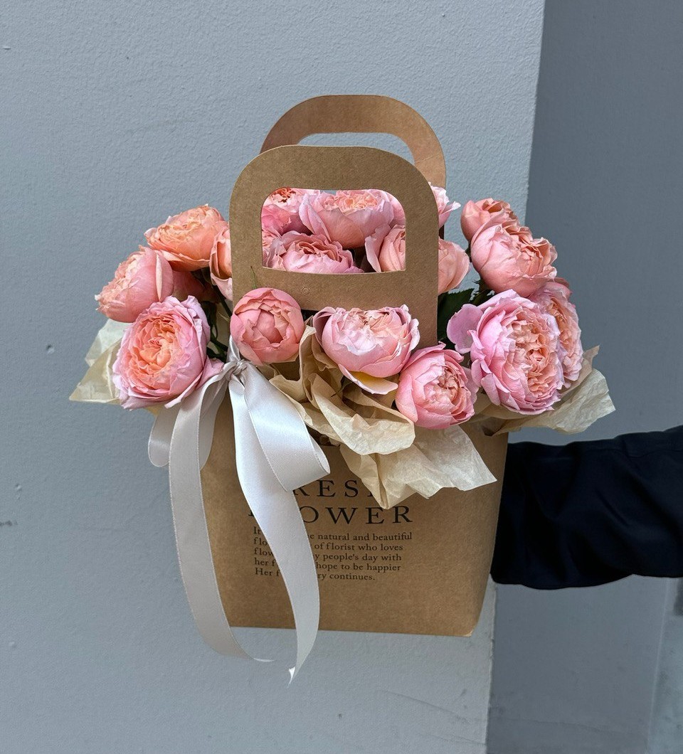 Композиция в крафтовой сумке с премиальными пионовидными розами сорта JULIETTE — это идеальный выбор для тех, кто ценит лаконичность и элегантность. Розы, обладающие нежным персиковым оттенком и насыщенной текстурой лепестков, в сочетании с натуральной расцветкой крафта, делает композицию универсальным презентом.