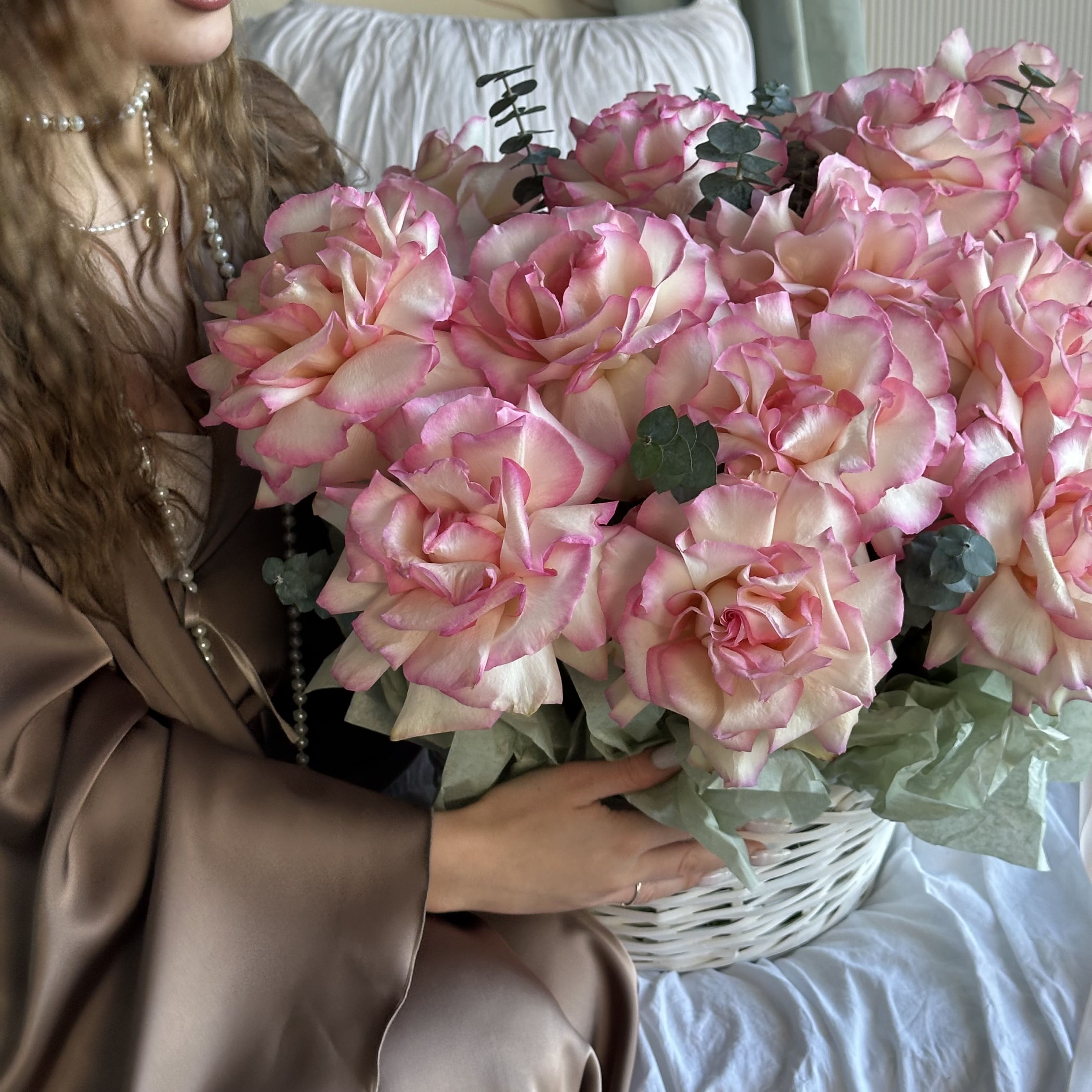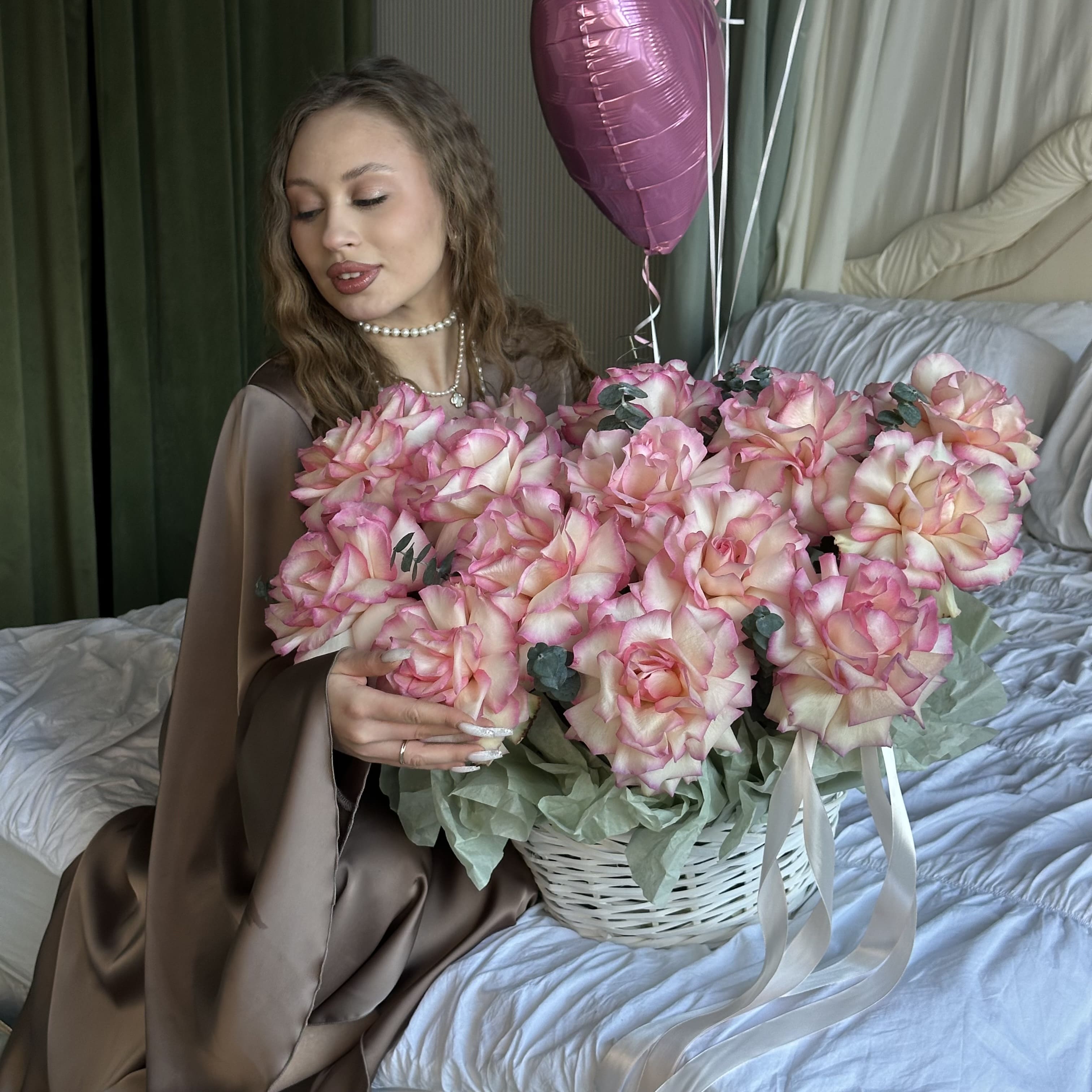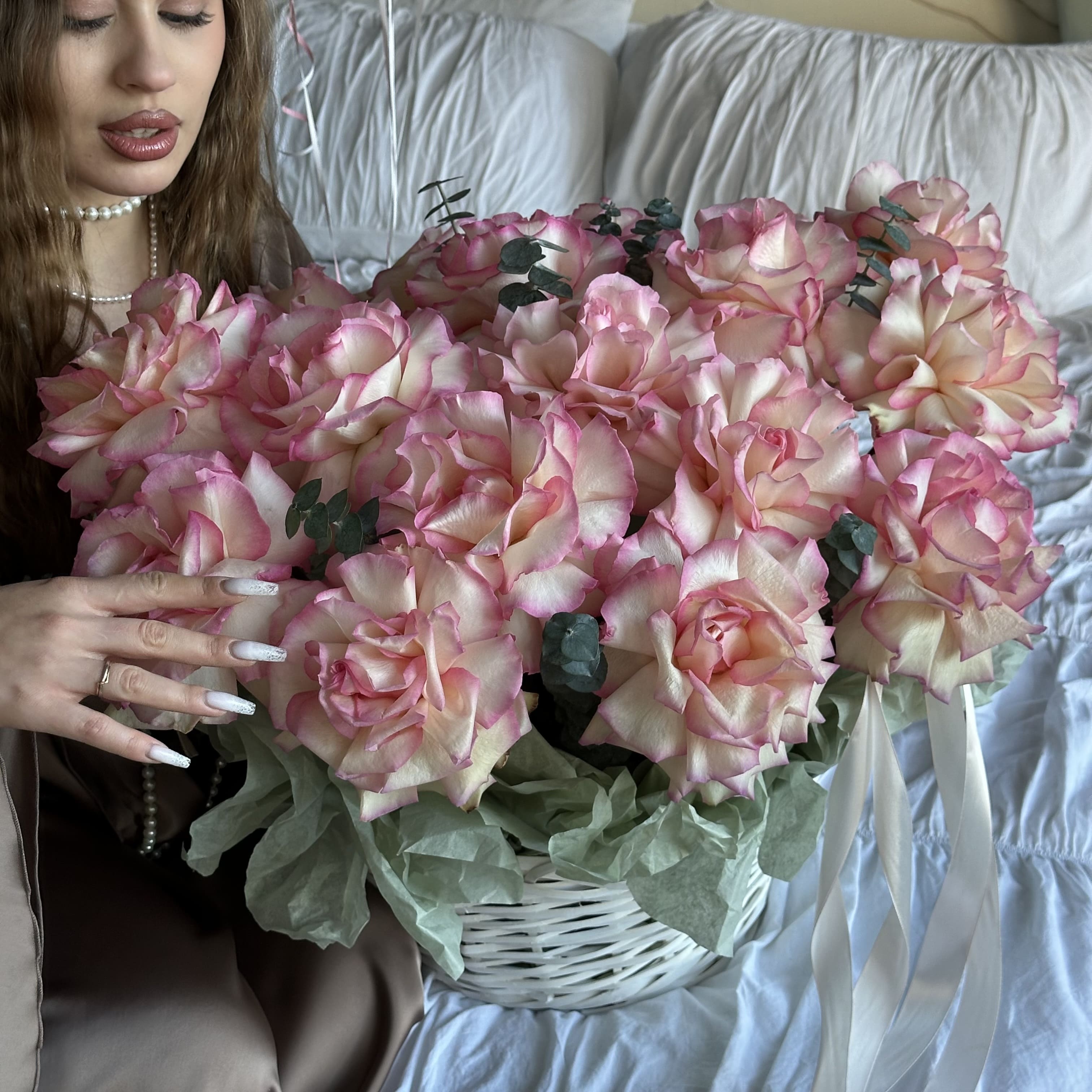 Корзина из 17 французских роз Эсперанс и веточек ароматного эвкалипта — это олицетворение роскоши и природной красоты. Нежность цветов сочетается с приятным ароматом эвкалипта, создавая незабываемое впечатление. Такой подарок способен выразить искреннюю заботу и глубокую симпатию, став украшением любого события и важным знаком внимания.