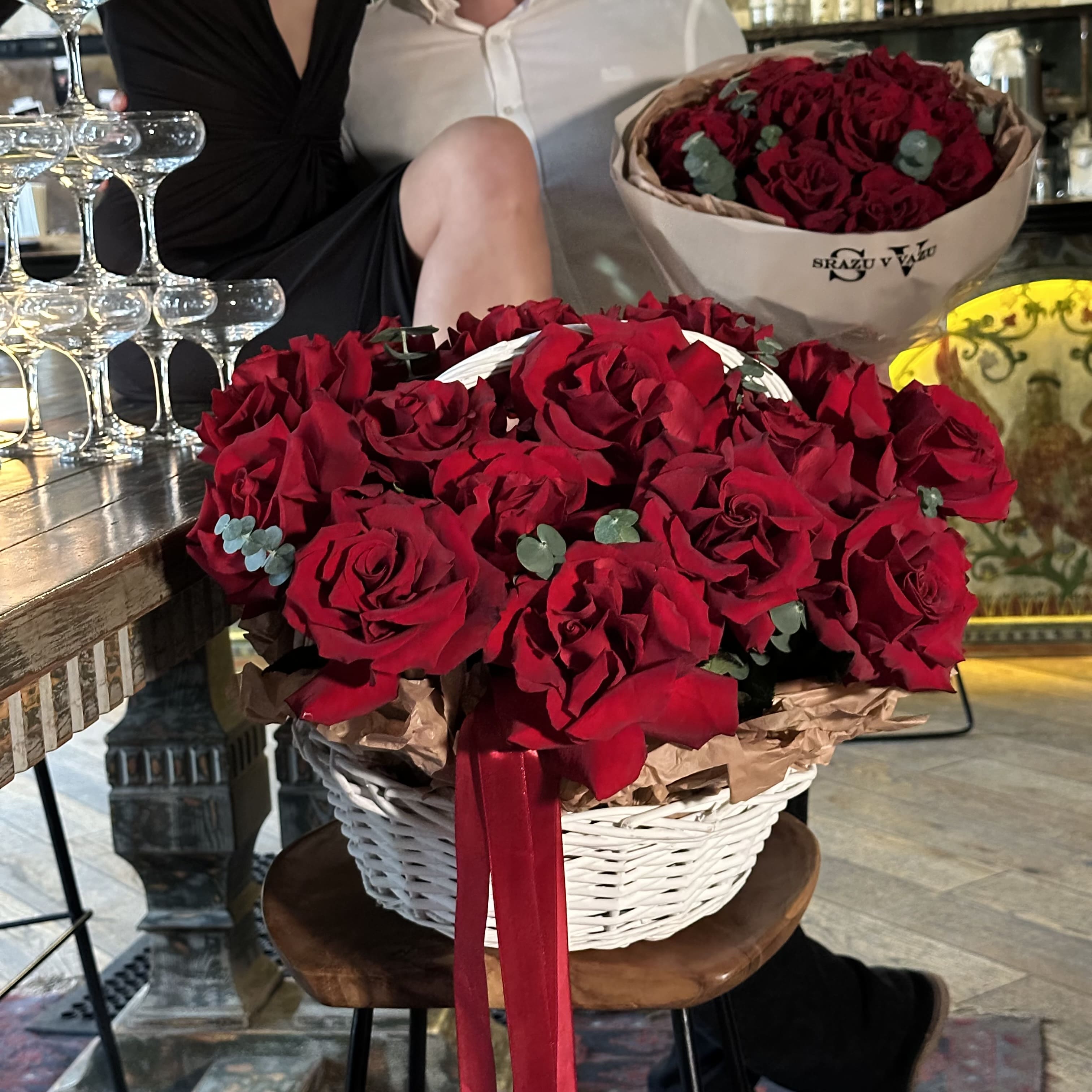 Моно-корзина из величественных 19 французских роз сорта EXPLORER, украшенная эвкалиптом, придавая композиции особый шарм и свежий аромат. Отличный выбор для подарка любимой и украшения интерьера.
