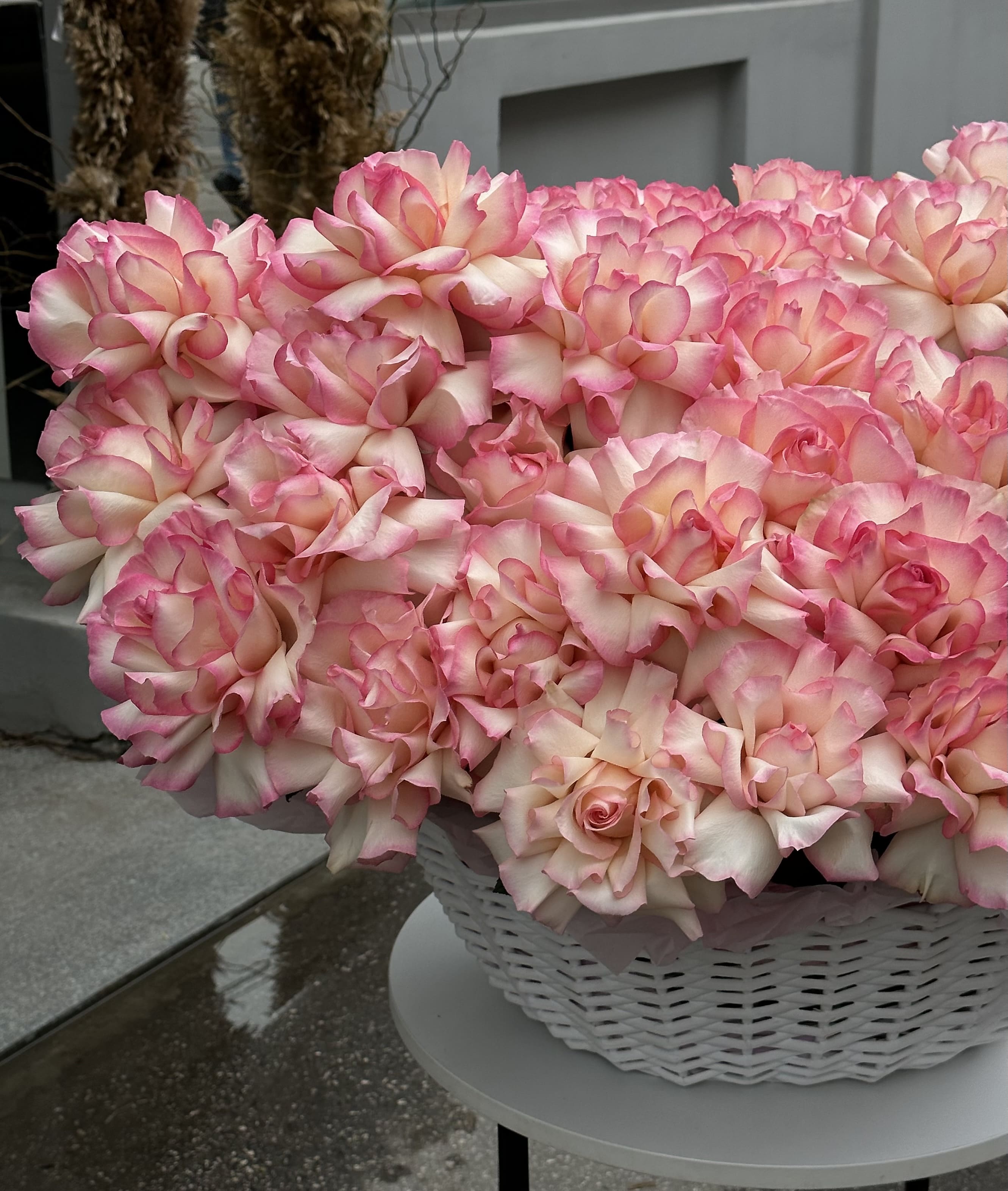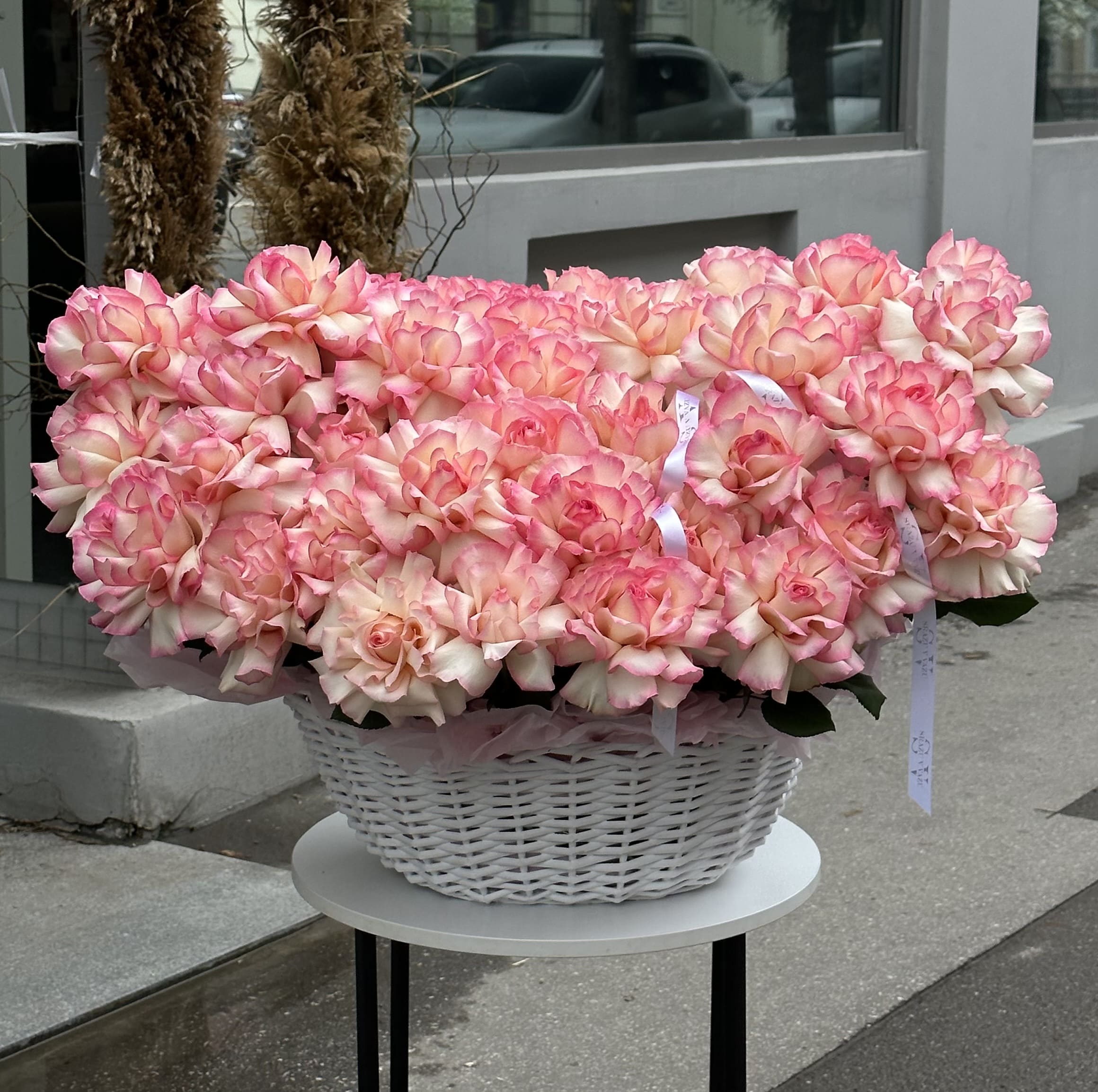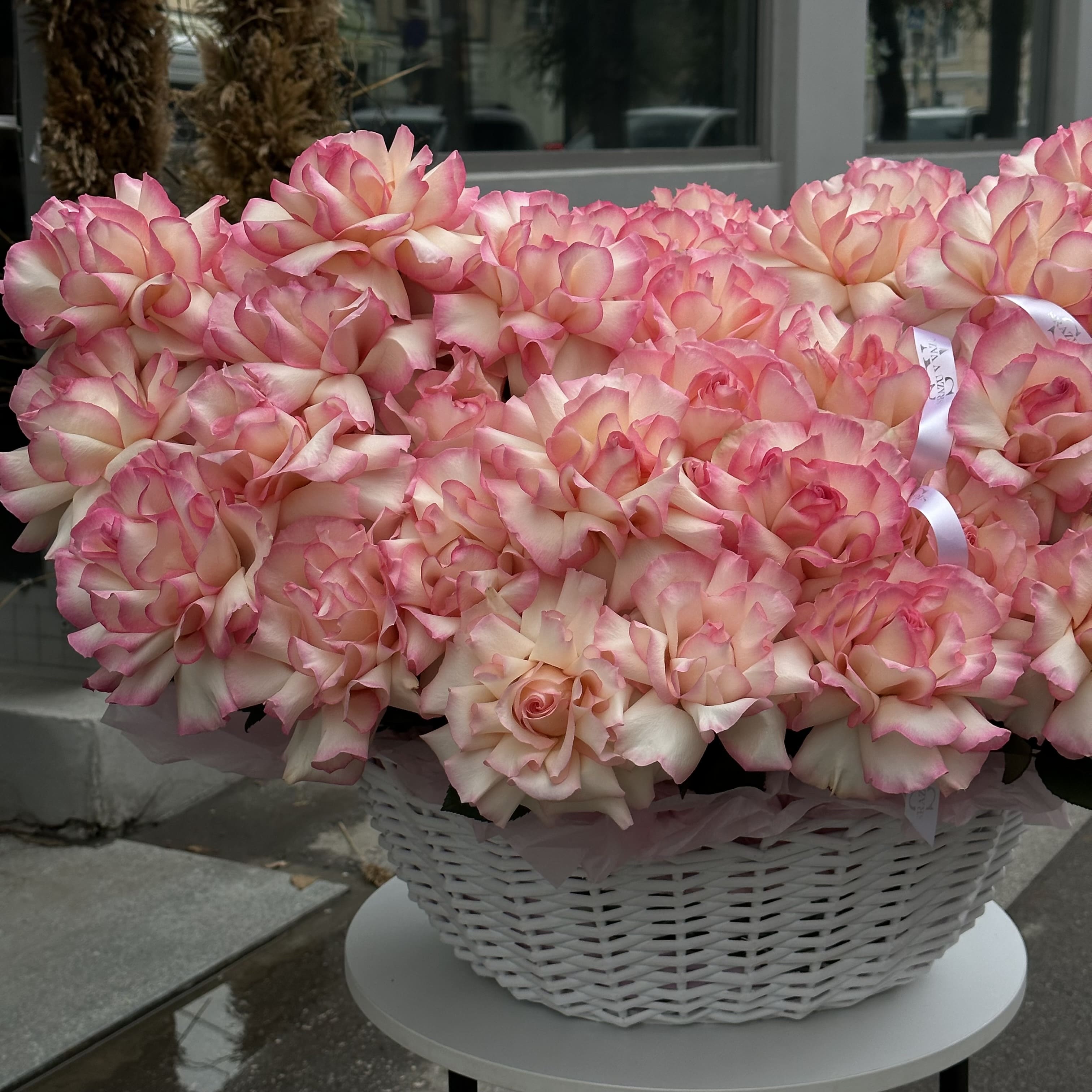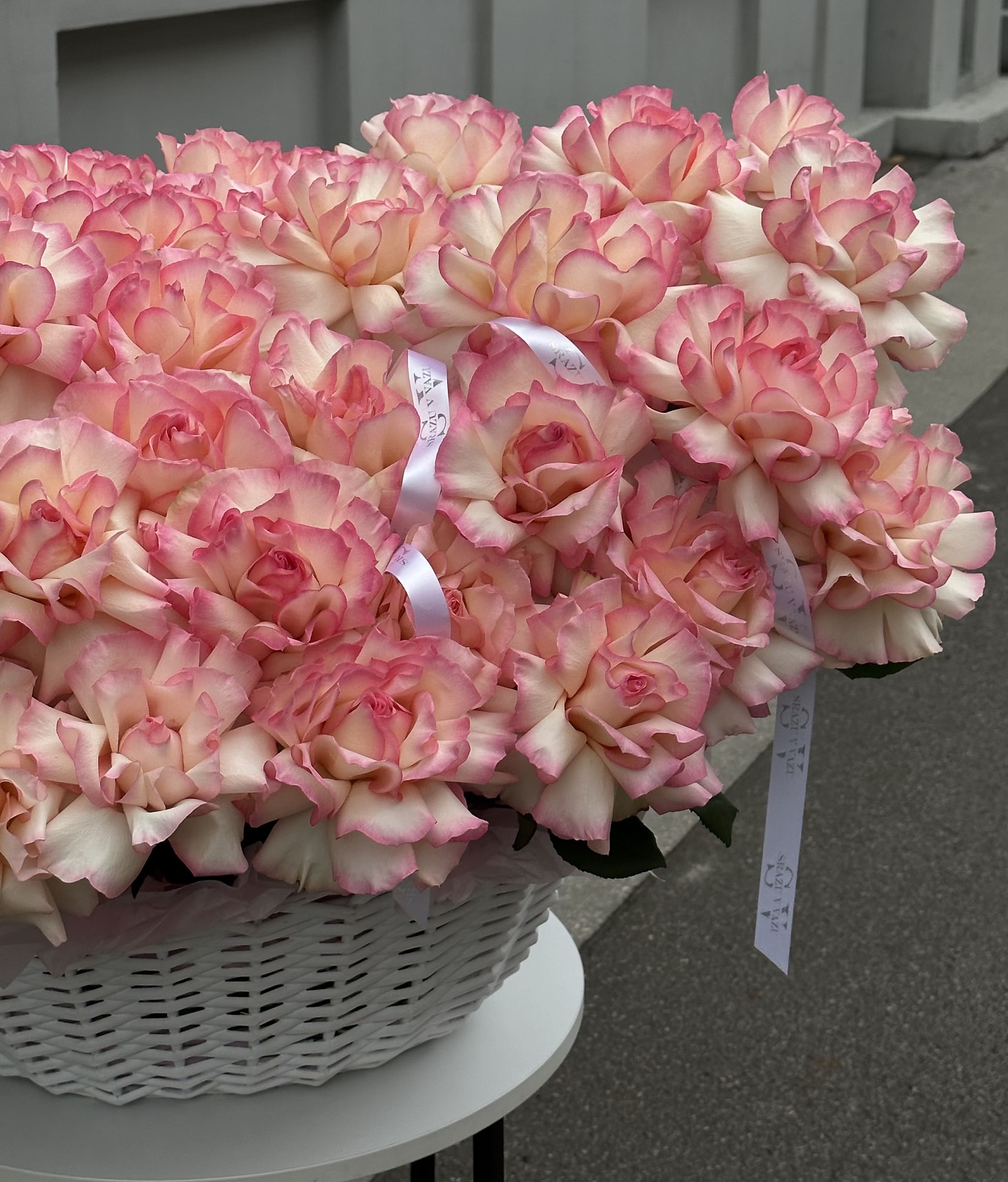 WOW корзина из 51 французской розы сорта ESPERANCE - попадание в самое сердце! Завораживает своим масштабом и объемом. Сдержанная моно композиция, которая не оставит равнодушным