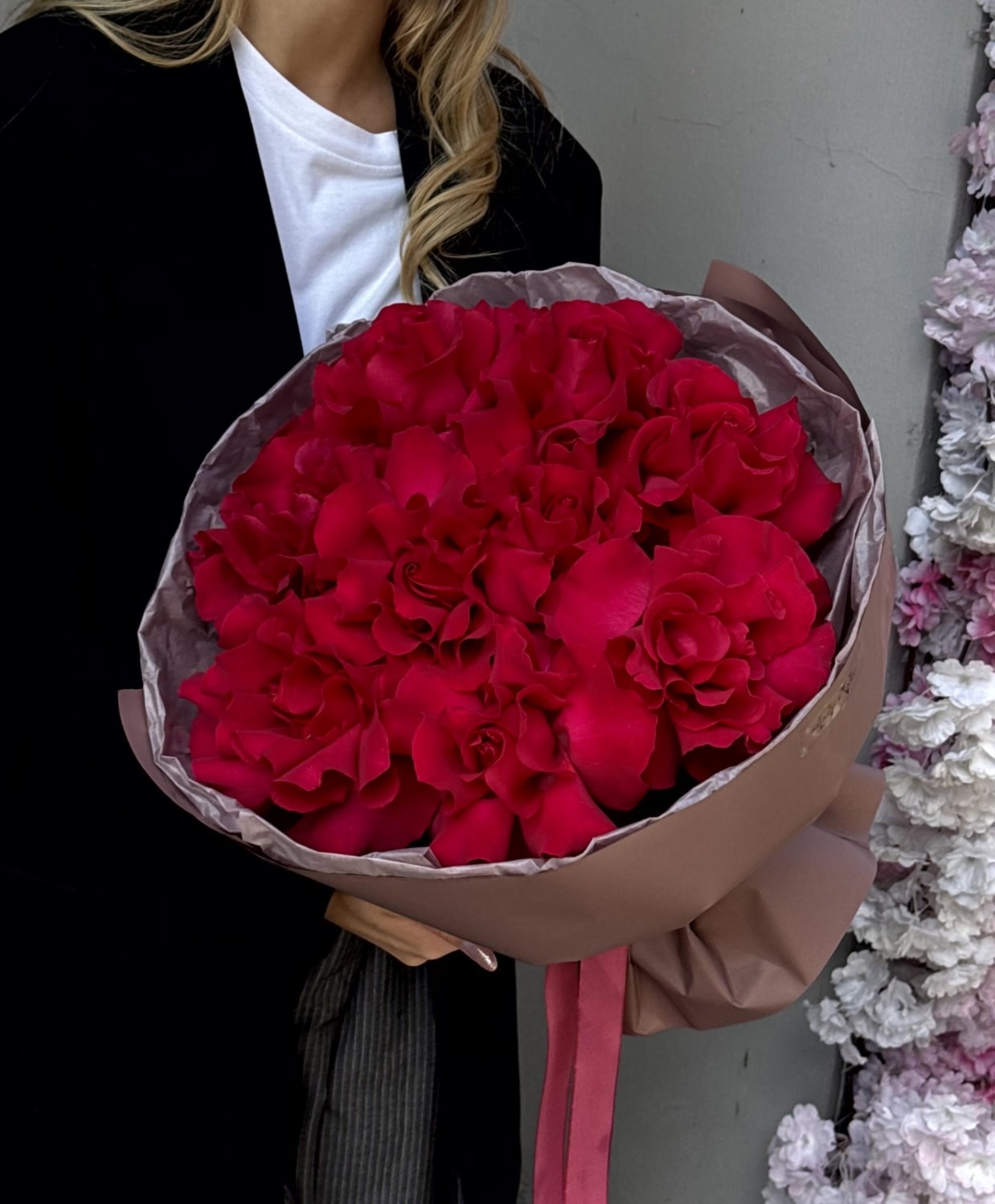 Моно букет из роз сорта GOTCHA это сочетание насыщенного цвета и бархатной текстуры нежных лепестков. Яркие большие бутоны с нежным ароматом станут запоминающимся презентом для вашего учителя