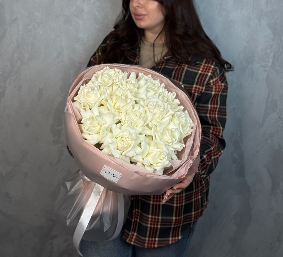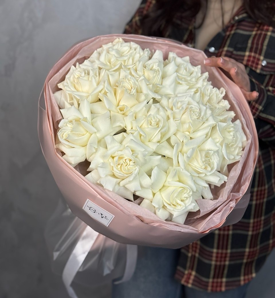 Букет из пионовидных роз сорта "Playa Blanca" — это воплощение чистоты и элегантности. Эти розы поражают своим ослепительным белым цветом, который излучает свежесть и невинность. Каждый бутон словно создан из нежного шелка, его бархатистая текстура и идеально сформированные лепестки создают ощущение утонченной роскоши.