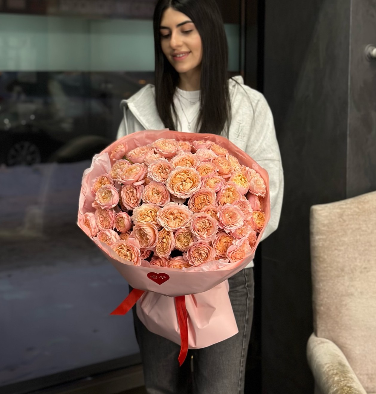 Премиальная пионовидная роза сорта "JULIETTE" — это один из самых известных и любимых сортов, символизирующий романтику и элегантность. Эти розы обладают крупными, многослойными бутонами, которые распускаются в великолепные цветы, напоминающие пионы. Их лепестки имеют нежный персиковый или кремовый оттенок, что придаёт букету теплоты и уюта