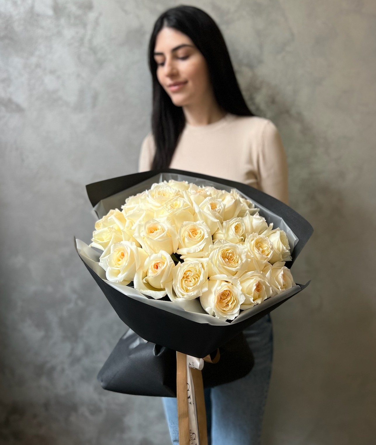 Моно букет из роз сорта " Candlelight" имеет теплый, кремово-желтый оттенок, который в процессе цветения может варьироваться от нежного пастельного до более насыщенного золотистого. Их окраска создает эффект свечения, что и дало название этому сорту.