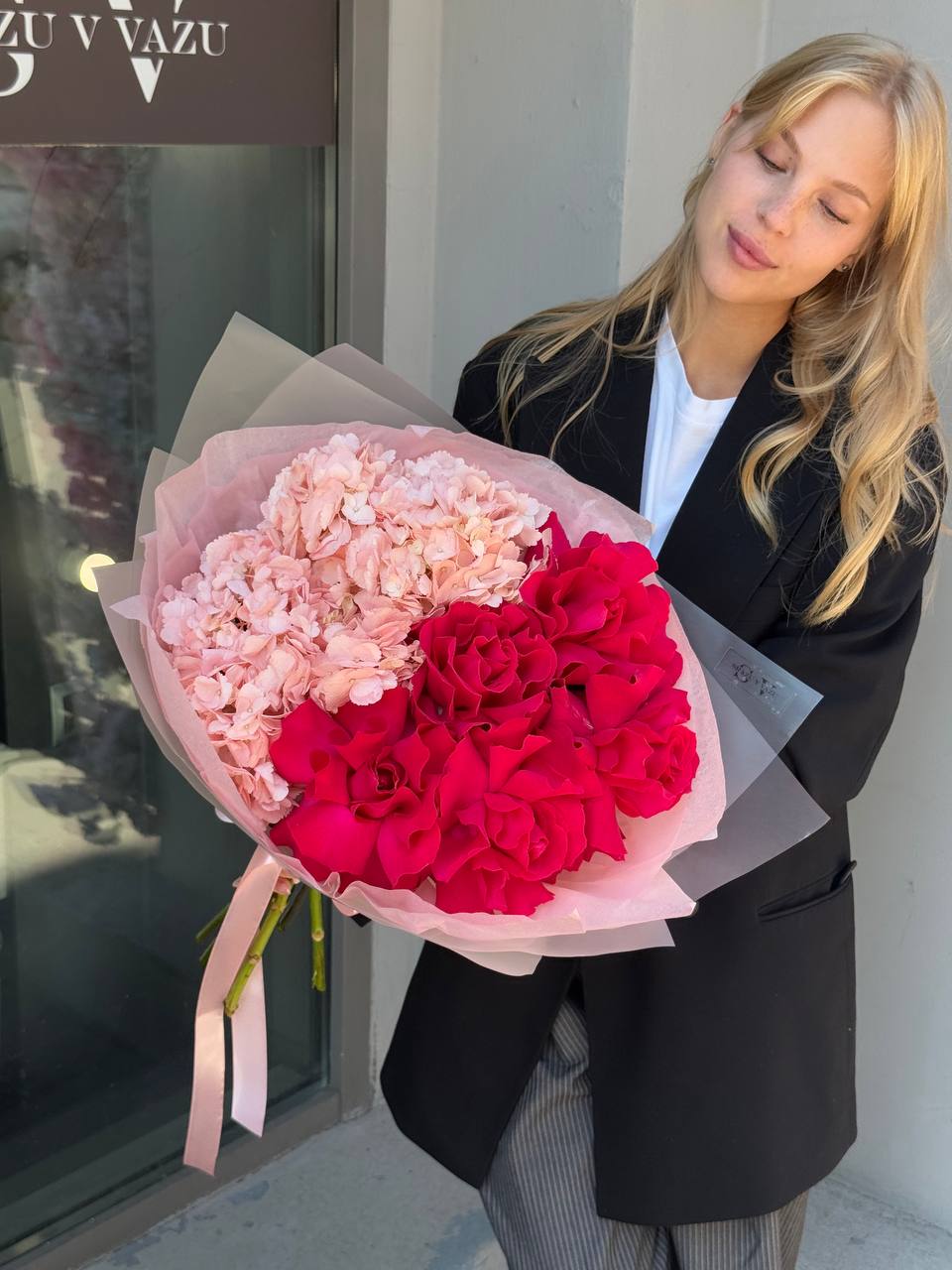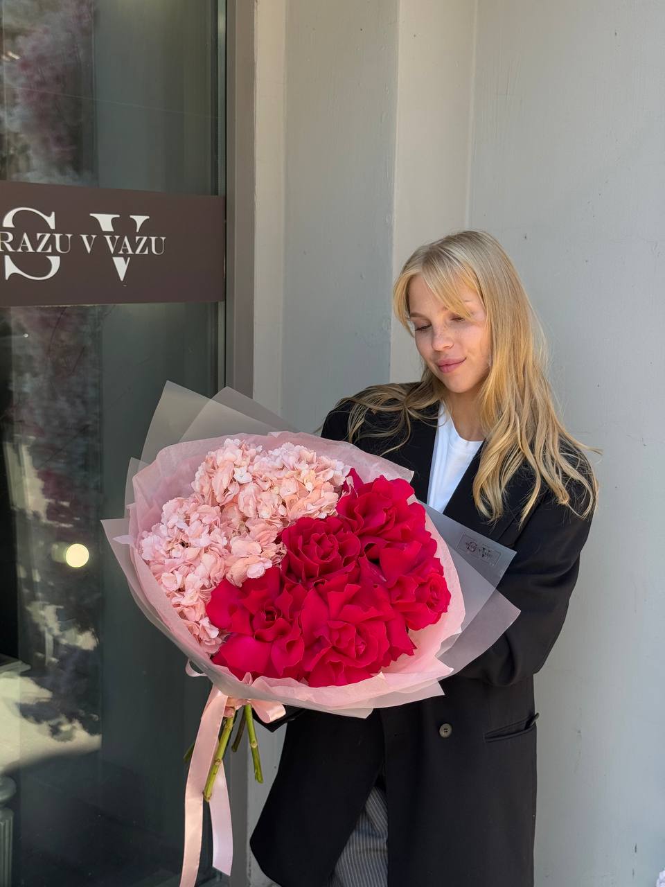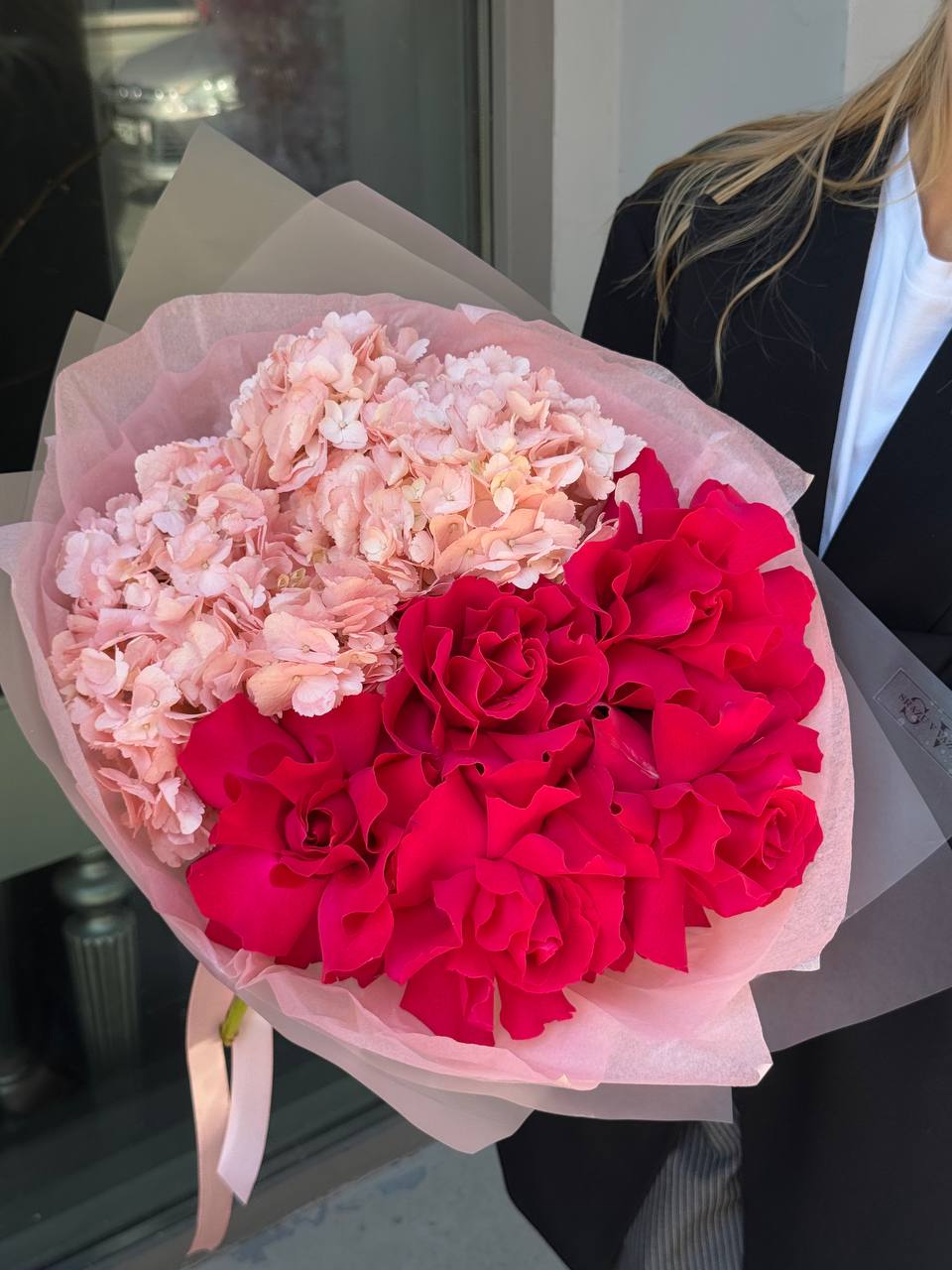 Розы сорта GOTCHA отличаются нежным запахом и глубоким оттенком фуксии, а розовая гортензия оттеняет своей мягкостью. Стильное и яркое сочетание для ваших любимых
