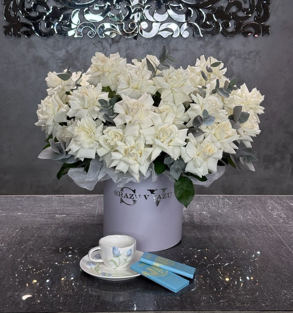 Нежная и воздушная композиция в шляпной коробке из премиальных французских роз Playa Blanca - белоснежная элегантность и объем. Зеленый эвкалипт как никогда прекрасен в окружении белоснежных роз
