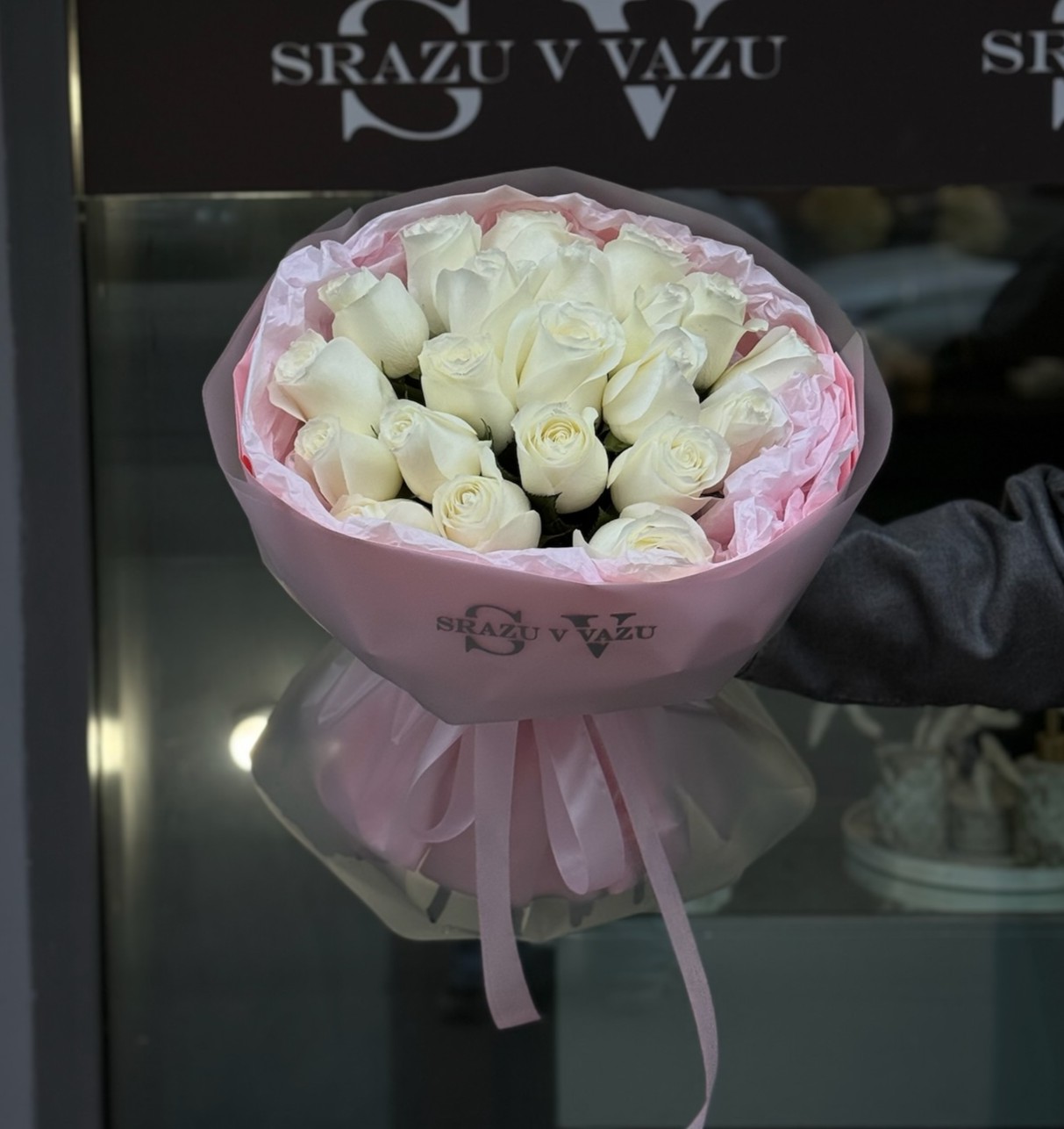 Белоснежная роза сорта "Proud" — это символ чистоты, элегантности и утонченности. Эти розы выделяются своими крупными, плотными бутонами и гладкими, шелковистыми лепестками, которые имеют ярко-белый цвет с легким кремовым оттенком. Их форма идеальна, что делает их особенно привлекательными в букете.