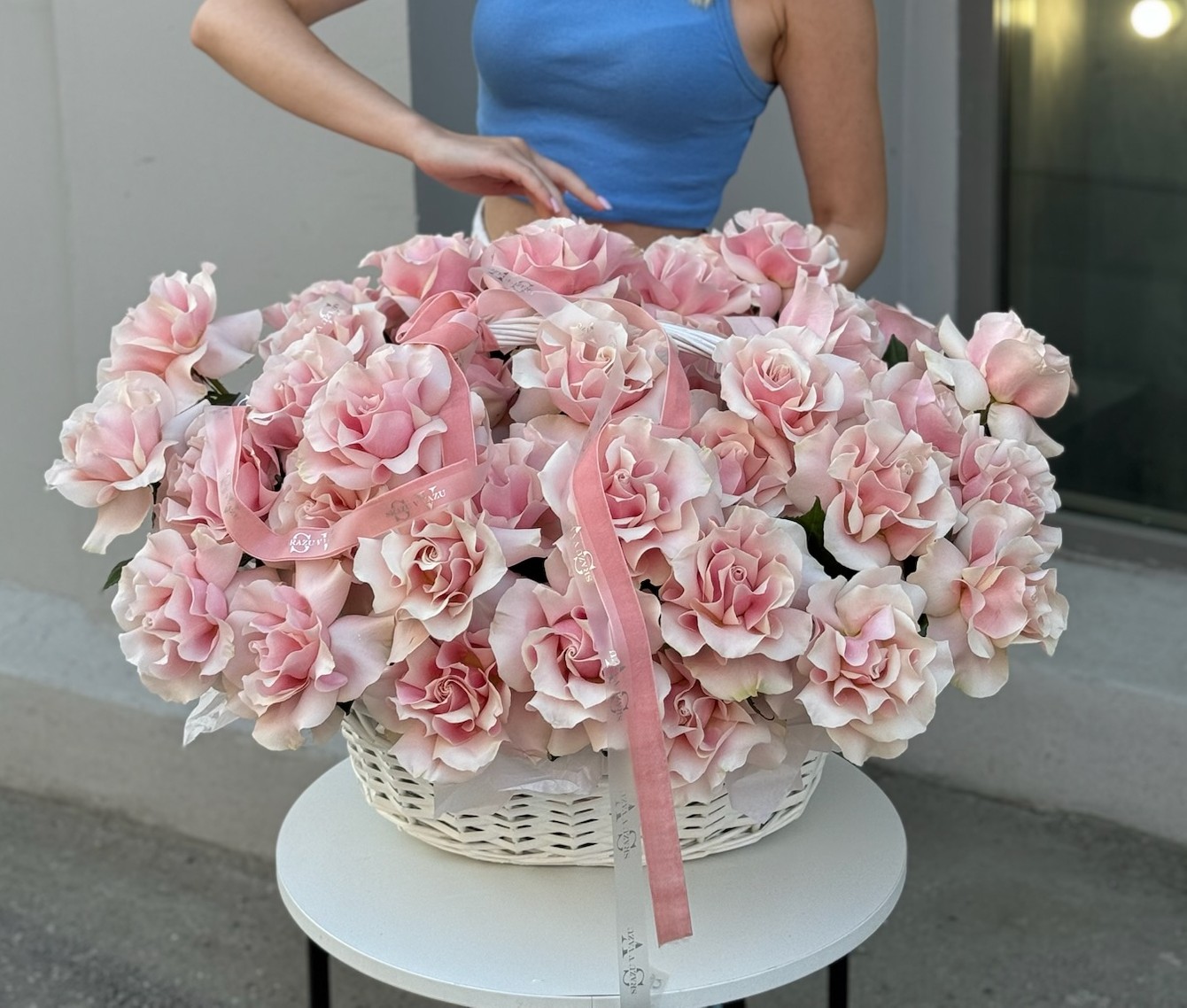 Большая композиция из нежных французских роз в плетеной ивовой корзине – это изысканное воплощение элегантности и романтики. Каждая деталь этой композиции призвана передать ваши необъятные и теплые чувства!
