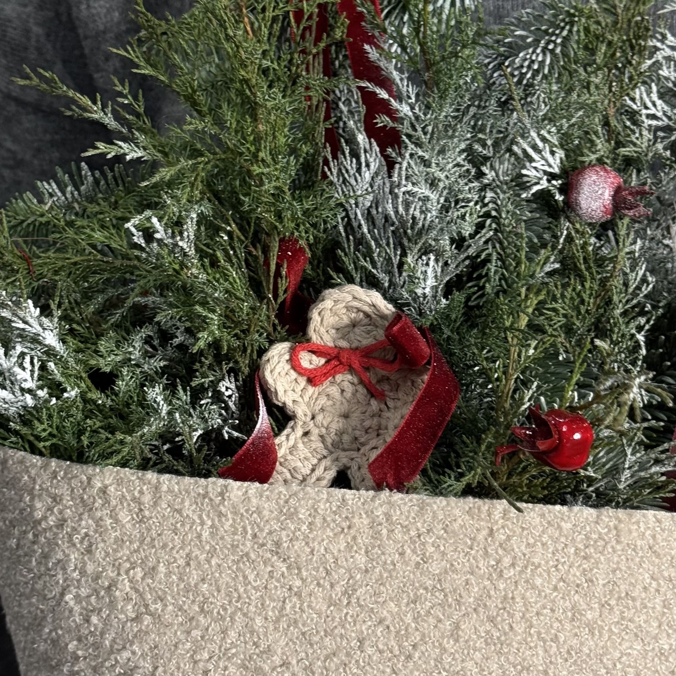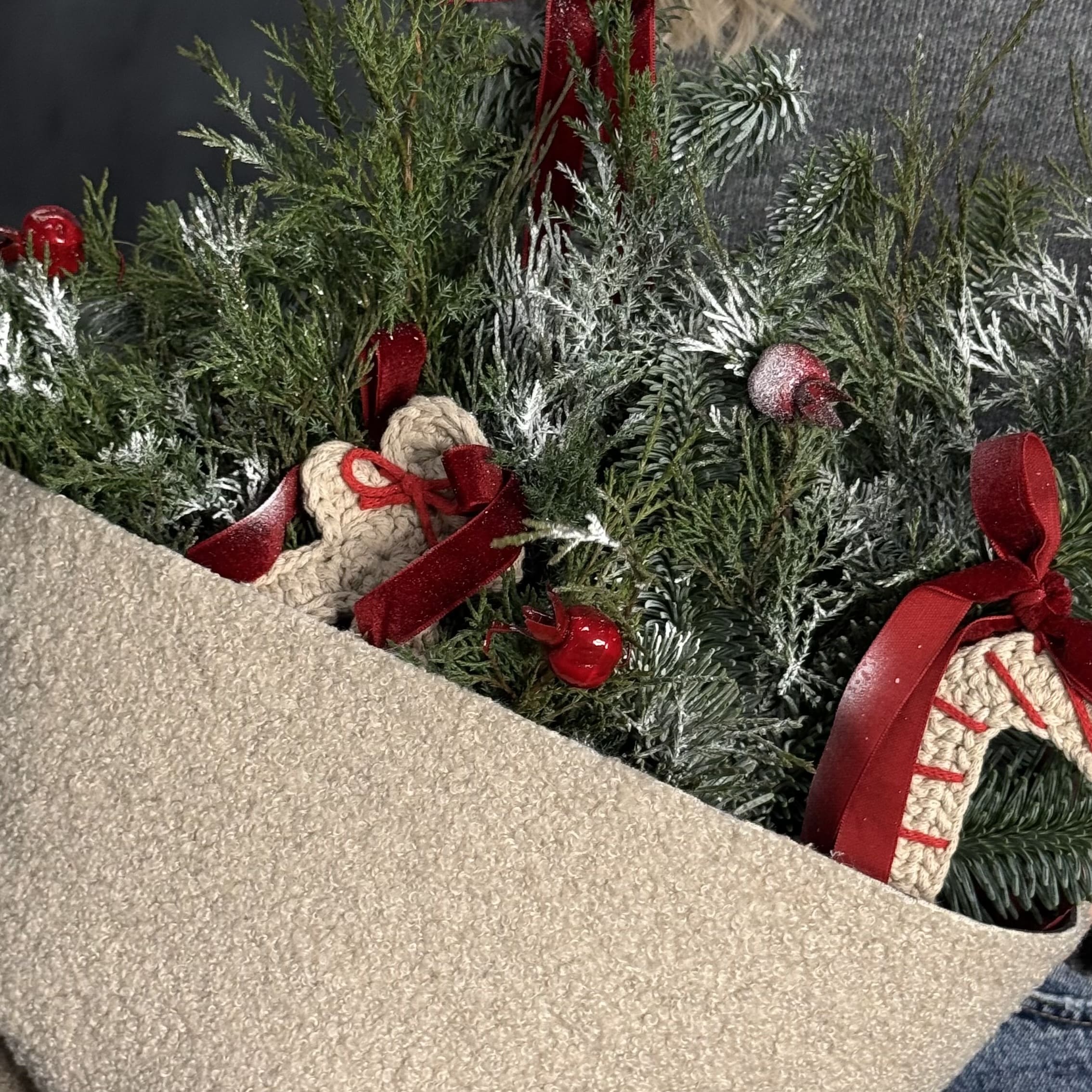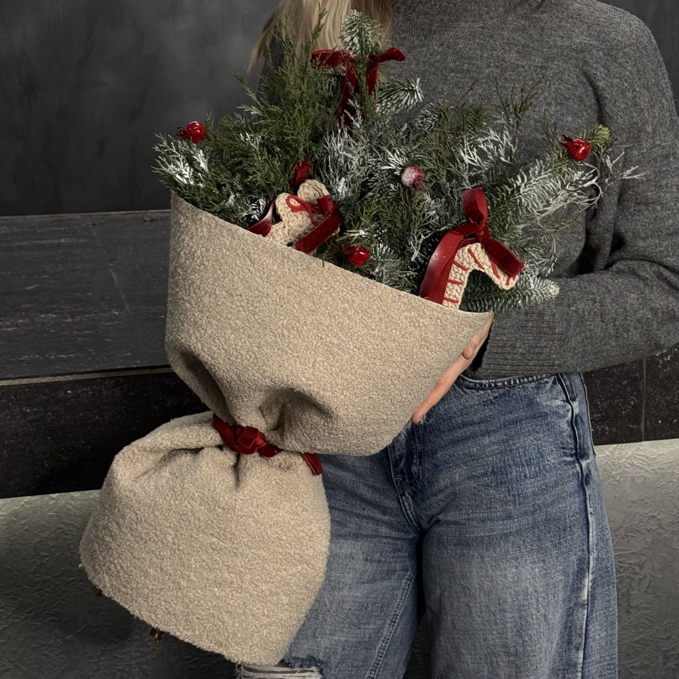 Новогодний букет в теплой гамме, созданный из ветвей благородного нобилиса, вязанных игрушек и стильного декора. Легкий аромат хвои, яркие акценты и уютная упаковка создают особую атмосферу праздника. Идеален для подарка родным и близким или эффектного украшения интерьера.