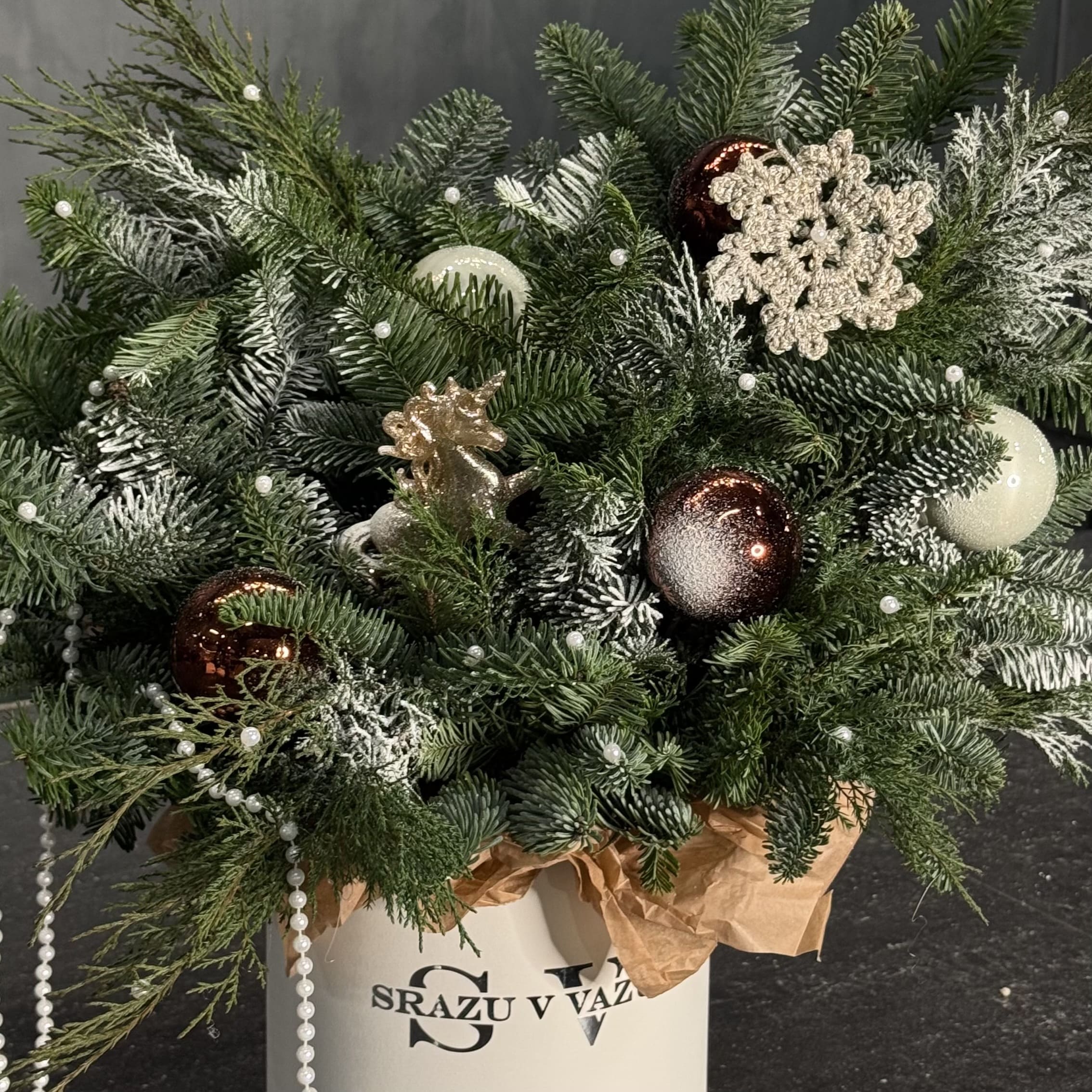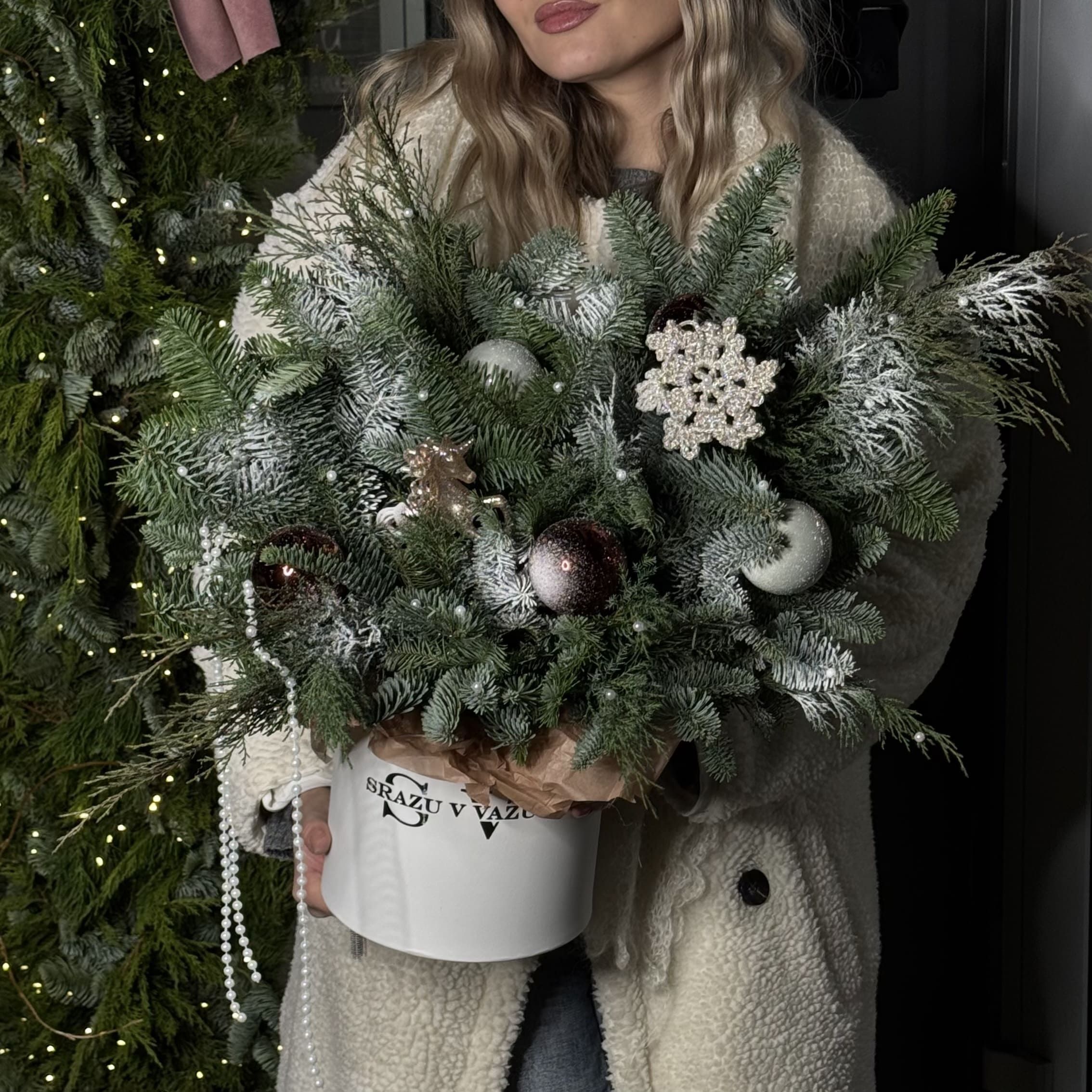 Новогодняя композиция в шляпной коробке — настоящее воплощение зимней сказки, наполненное очарованием и волшебством праздника. Игрушки выполнены преимущественно в белом цвете, символизирующем чистоту, свежесть и начало нового этапа. Это прекрасный способ выразить свое внимание и заботу, подарив частичку тепла и радости наступающего Нового Года.