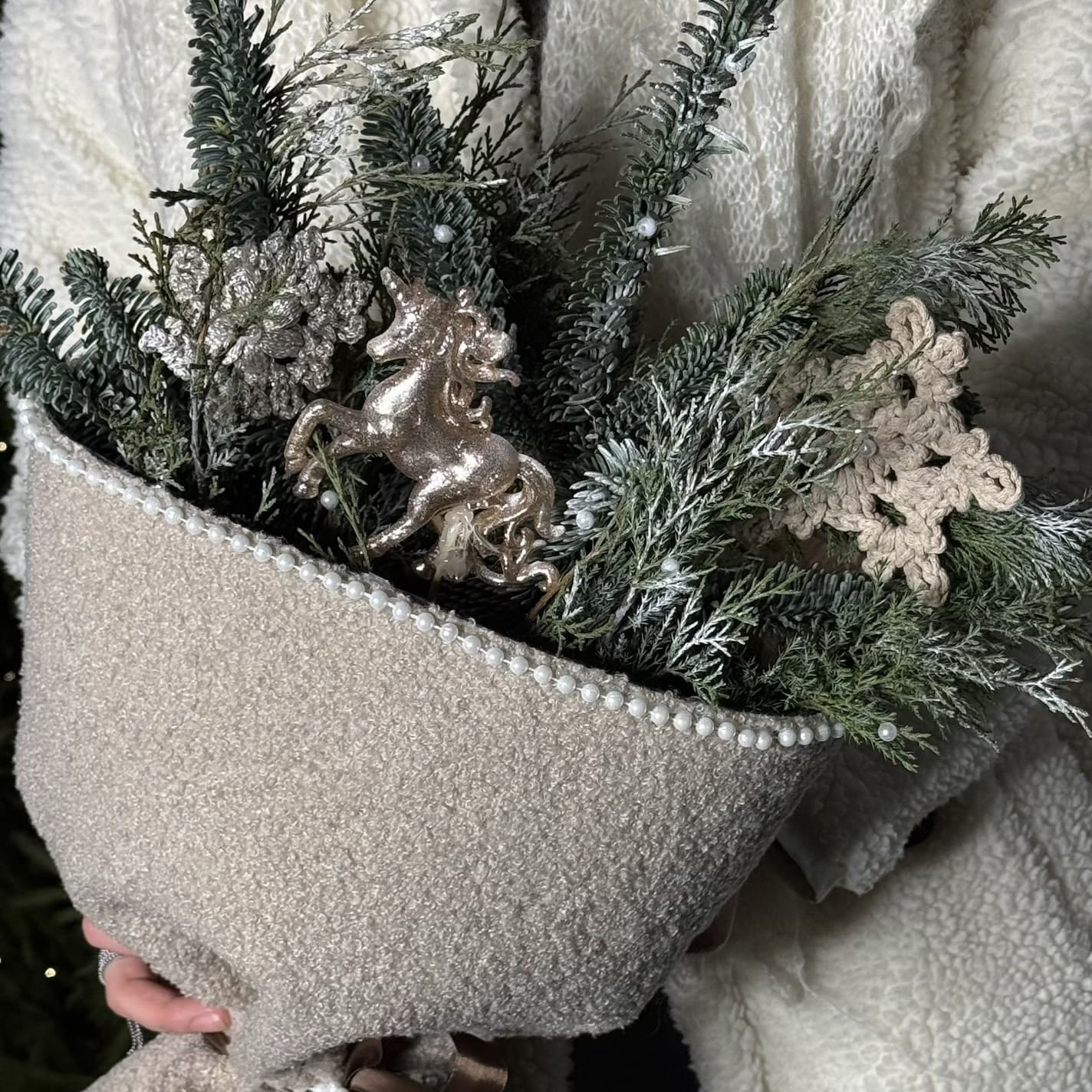 Букет в новогодней тематике в мягкой уютной упаковке с вязанным и игрушечным декором - супер подарок, чтобы подарить настроение наступающего Нового года. Отличный выбор для тех, кто ценит стильные и необычные цветочные решения.