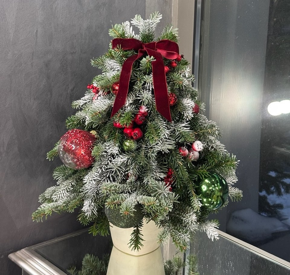 Новогодняя композиция в виде елки — это яркий и оригинальный элемент праздничного декора, который создает атмосферу волшебства и уюта в доме. Композиция выполнена из свежих веток пихты и нобилиса, украшена традиционно-новогодними елочными игрушками красных цветов. Фактурная бархатная лента эффектно завершает праздничную композицию!