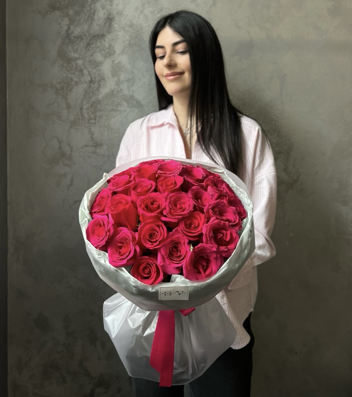 Букет из 29 роз сорта "Gotcha" — это стильное выражение элегантности и романтики. Эти розы поражают своим глубоким ярким цветом и насыщенным чувственным ароматом.