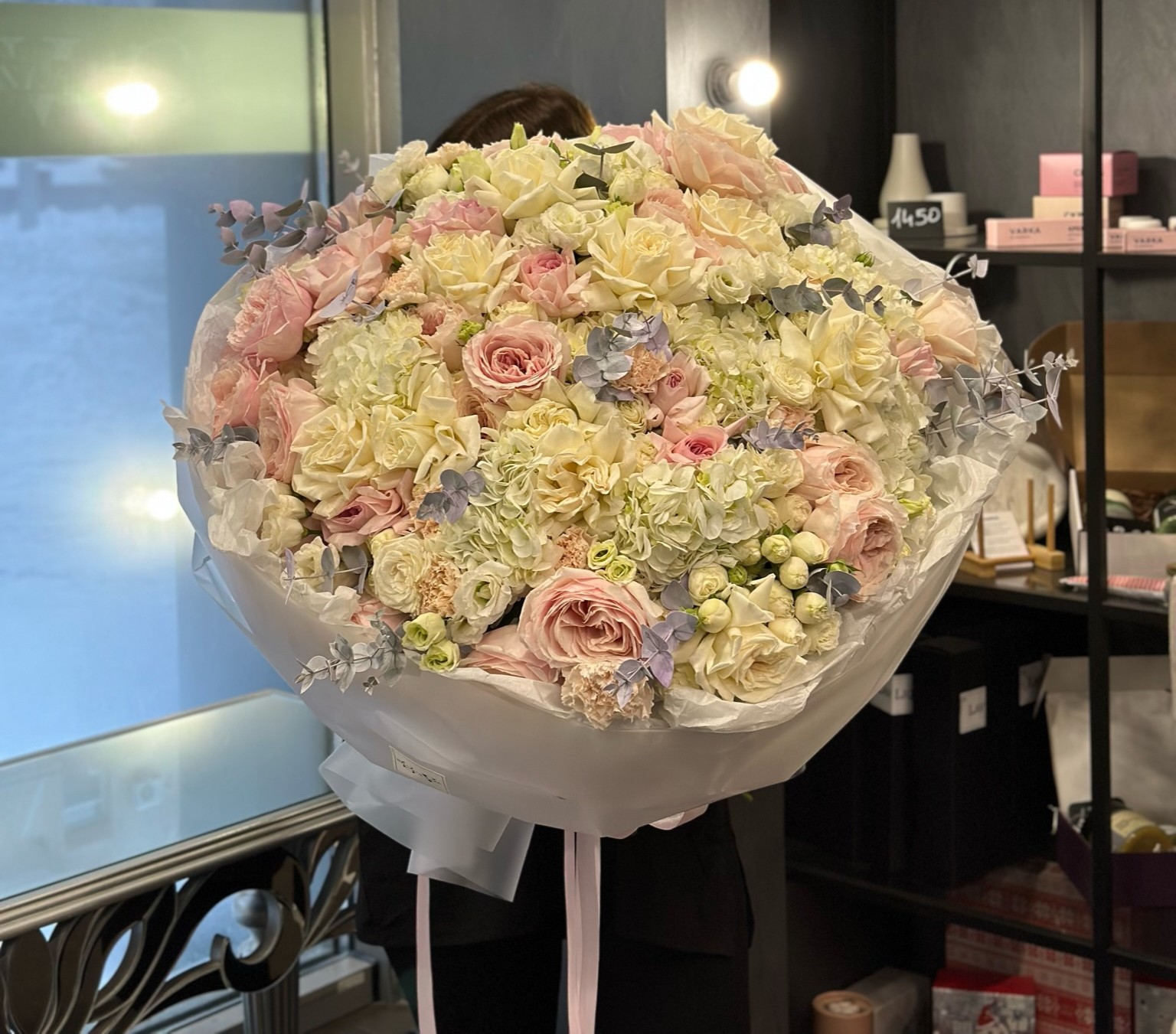 Беспроигрышное сочетание белоснежной гортензии и нежных пионовидных роз сорта "Tsumugi" , хрустящей эустомы и эквадорских роз сортов "Playа Blanca" и "Pink Ohara". Истинная нежность в размере XXL. Фиолетовые веточки эвкалипта удачно контрастируют в букете, подчеркивая нежное розово-белое сочетание.