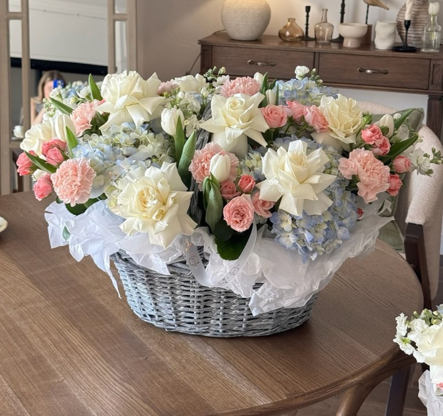 Заказать Корзина цветов с тюльпанами,гортензиями и розами с доставкой по Самаре