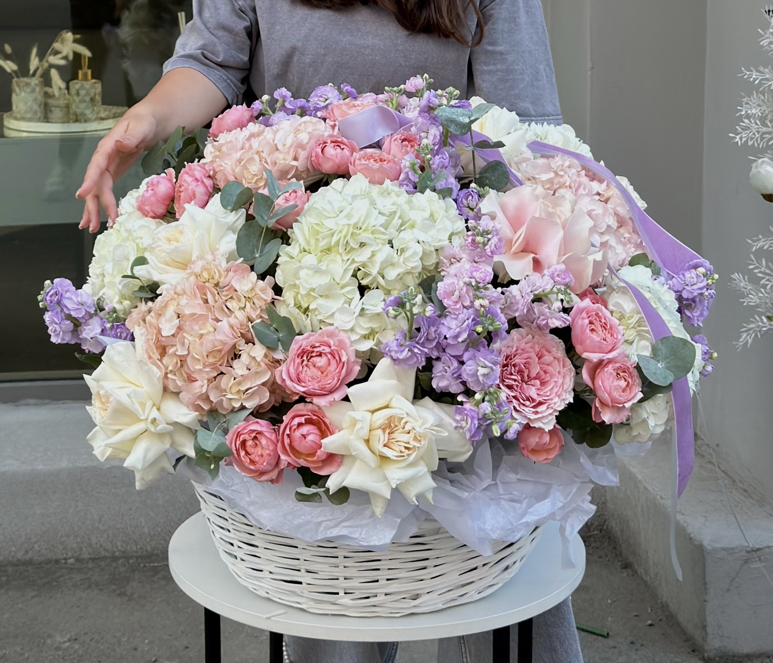 Яркая, за счёт ароматной сиреневой маттиолы, и нежная, благодаря парфюмированной розе White O'Hara и нежно-розовой гортензии, гигантская композиция в плетёной корзине — это отличный повод выразить свои чувства. Такая композиция станет отличным подарком как для любимой мамы, так и для обожаемой девушки.