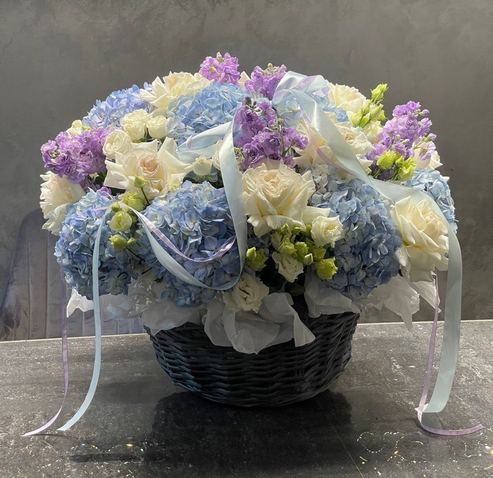Заказать Корзина цветов с голубыми гортензиями и лиловой маттиолой с доставкой по Самаре