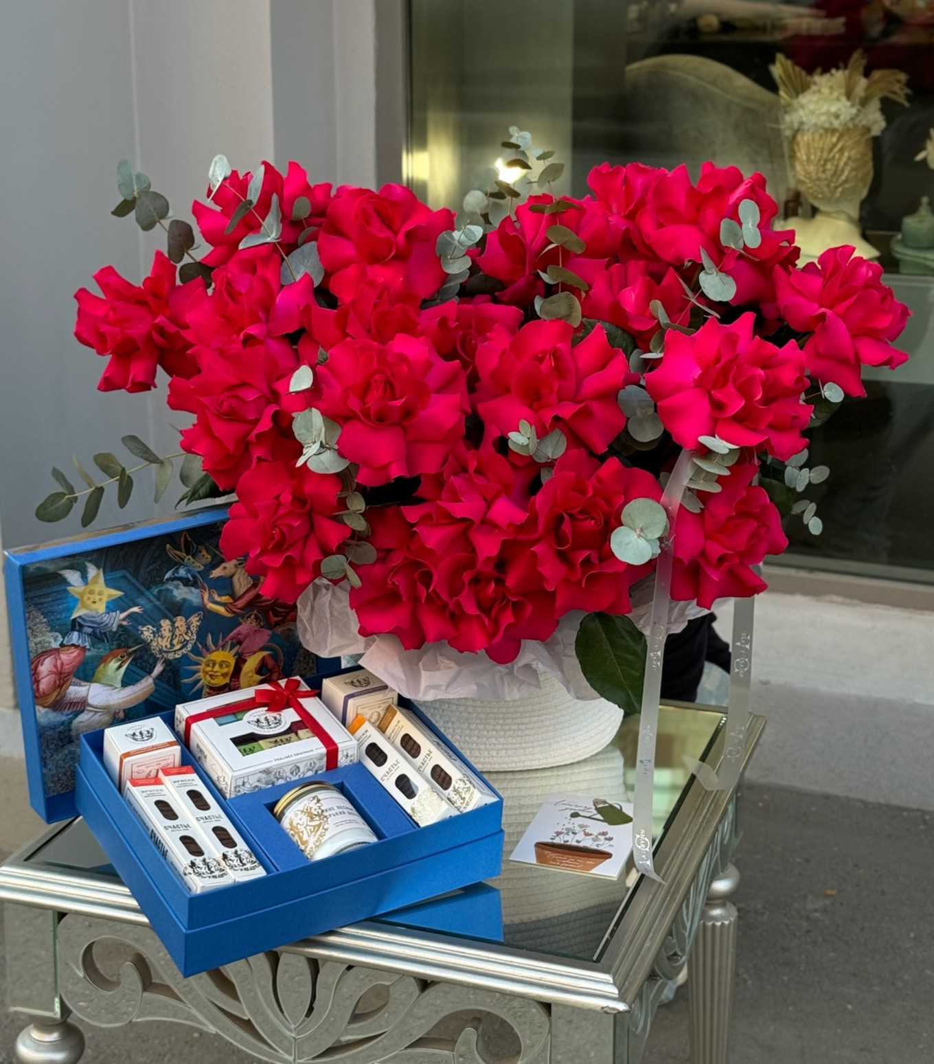 Гигантская композиция с WOW эффектом из французских роз Gotcha с зелеными веточками эвкалипта никого не оставит равнодушным. Огромное яркое благоухающее облако из вывернутых роз как нельзя лучше выразит всю широту Ваших чувств.